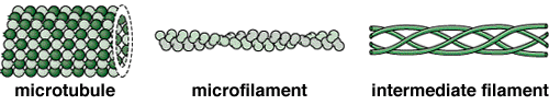 Mikrofilamenty majú priemerne hrúbku 4 – 7 nm. Nachádzame ich často v hustých konglomerátoch v mikroklkoch, pod cytoplazmatickou membránou, v pseudopódiách a pod. Základné mikrofilamenty sú zložené z aktínu – kontraktibilnej bielkoviny nachádzajúcej sa hromadne vo svaloch. V mikrofilamentoch cytoskeletu je označovaný ako cytoplazmaticky aktín. Myozín sa už podarilo dokázať v cytoplazme leukocytov, makrofágov trombocytov, hepatocytov a v iných bunkách. Intracelulárne pohybové mechanizmy si takisto vyžadujú prítomnosť energie z ATP a iónov Ca2+. Intermediárne filamenty svojou hrúbkou 6 – 13 nm predstavujú akýsi stred (intermediaritu) medzi mikrofilamentami a najhrubšími mikrotubulmi (20 – 40nm). Spravidla sú to nekontraktibilné filamenty, ktorým sa pri tvorbe cytoskeletu prisudzuje spevňujúca funkcia, pretože sú odolné voči ťahu a tlaku. Mikrotubuly tvoria systém jemných tubulov s hrúbkou 20 – 40 nm a s lúmenom 10 – 20 nm. Mikrotubuly sa utvárajú ako kvartérna štruktúra sférického proteínu – tubulínu.